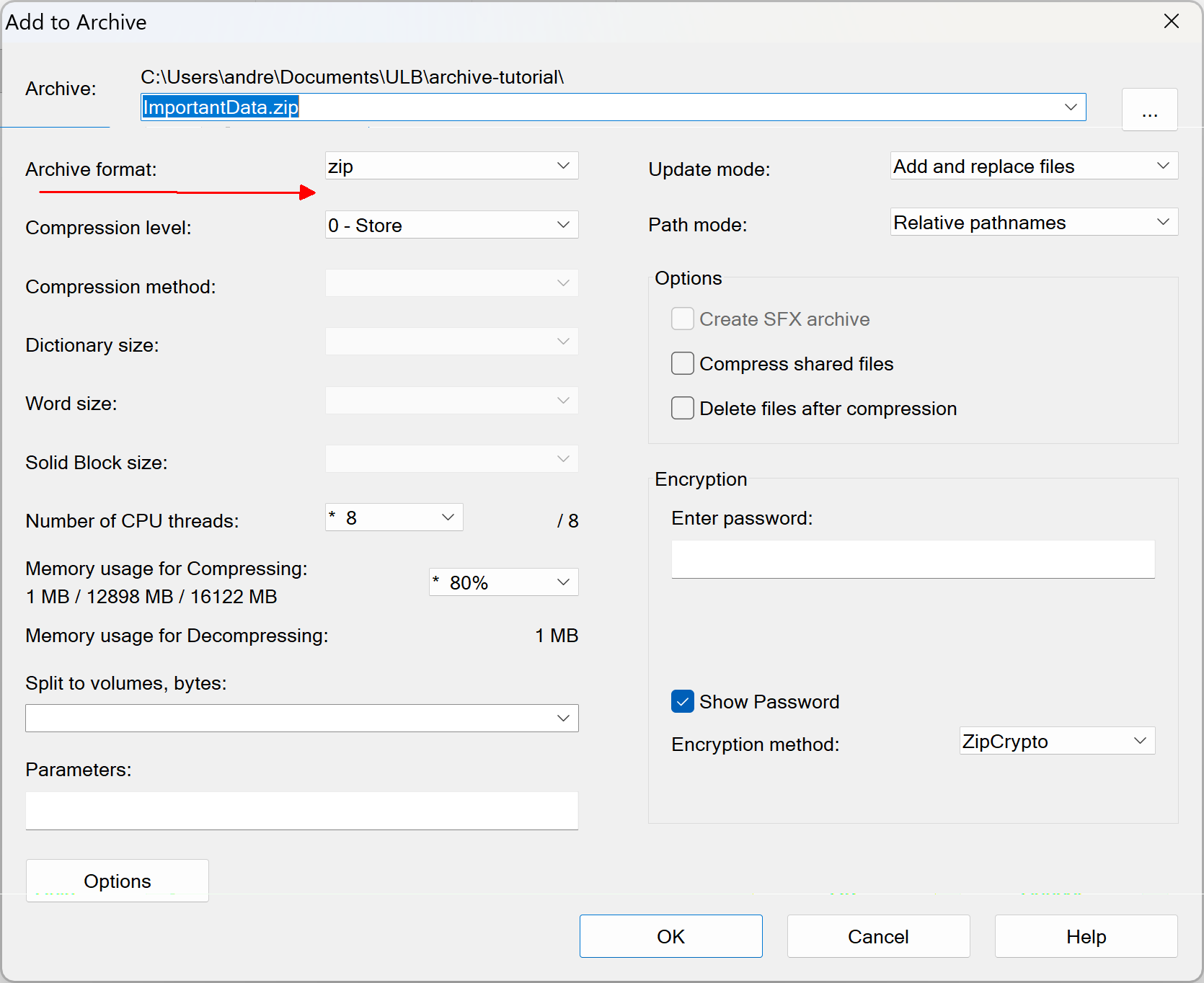 In the menu that appears, select "zip" as the archive format and "0 - Store" as the compression level. Then click "OK."
