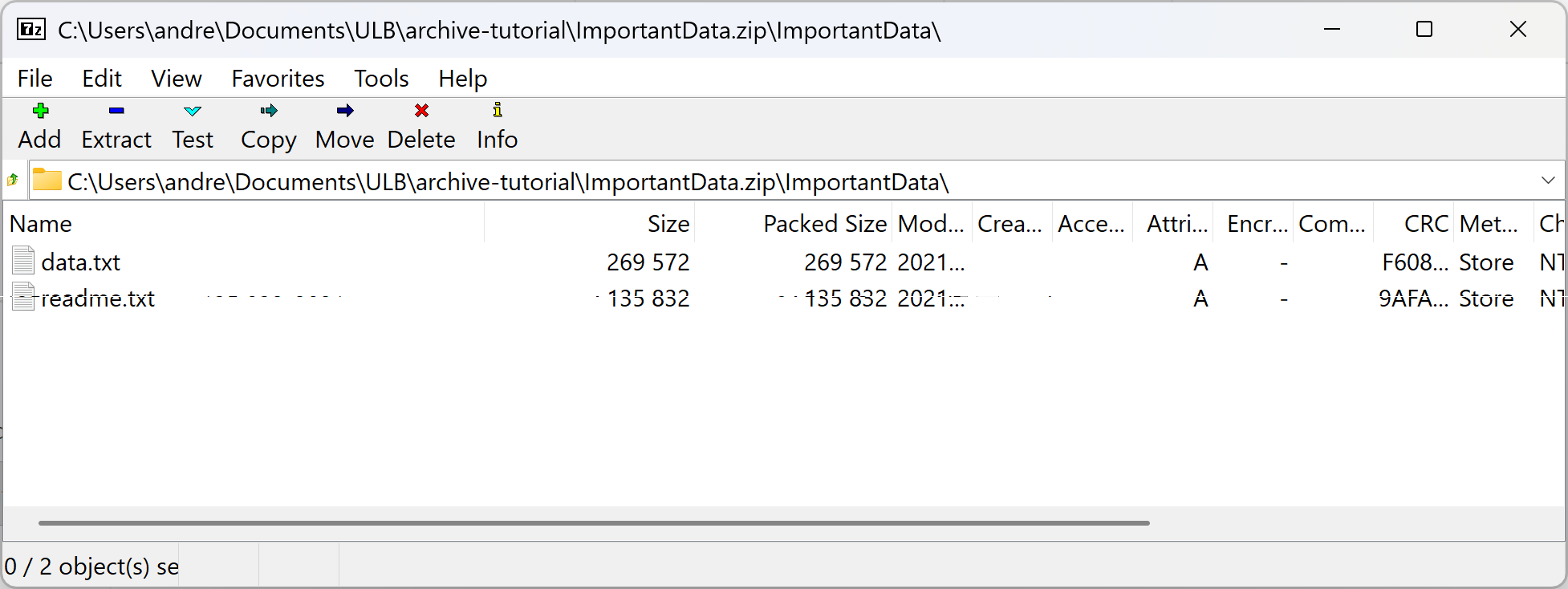 If you open the newly created .zip file, all entries should show "store" as the method, and the size and packed size should be identical.