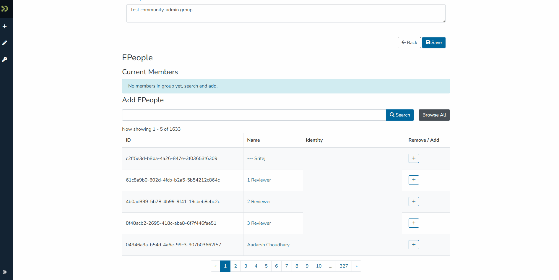 Um weiteren Benutzer:innen Administrator-Rechte einzuräumen, muss die Berechtigungsgruppe erweitert werden. Navigieren Sie hier über die linke Navigationsleiste unter dem Punkt "Bearbeiten" zum jeweiligen Bereich oder der jeweiligen Sammlung und klicken Sie auf "Rollen zuordnen". Ihnen wird dann eine Gruppe in der Form COMMUNITY_xxx_ADMIN angezeigt. Bearbeiten können Sie die Gruppe durch Klicken auf die Gruppenname. Benutzer:innen können über die Suchleiste durch die Eingabe des Nachnamens oder Vornamens gefunden und als Mitglieder hinzugefügt werden, wenn Sie schon einmal bei TUdatalib eingeloggt waren.