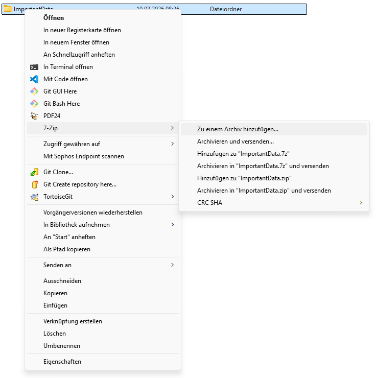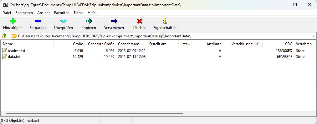 Folgende Anleitung zeigt beispielhaft, wie in 7-Zip aus einem Ordner eine unkomprimierte .zip Datei erstellt werden kann. Die Anleitung wurde erstellt unter Windows 11 mit 7-Zip Version 26.00. 7-Zip ist freie Software und erhältlich unter https://www.7-zip.org.