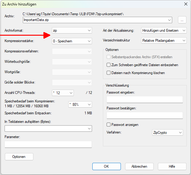 In dem erscheinenden Menü wählen Sie als Archivformat "zip" und als Kompressionsstärke "0 - Speichern". Klicken Sie dann auf "OK".